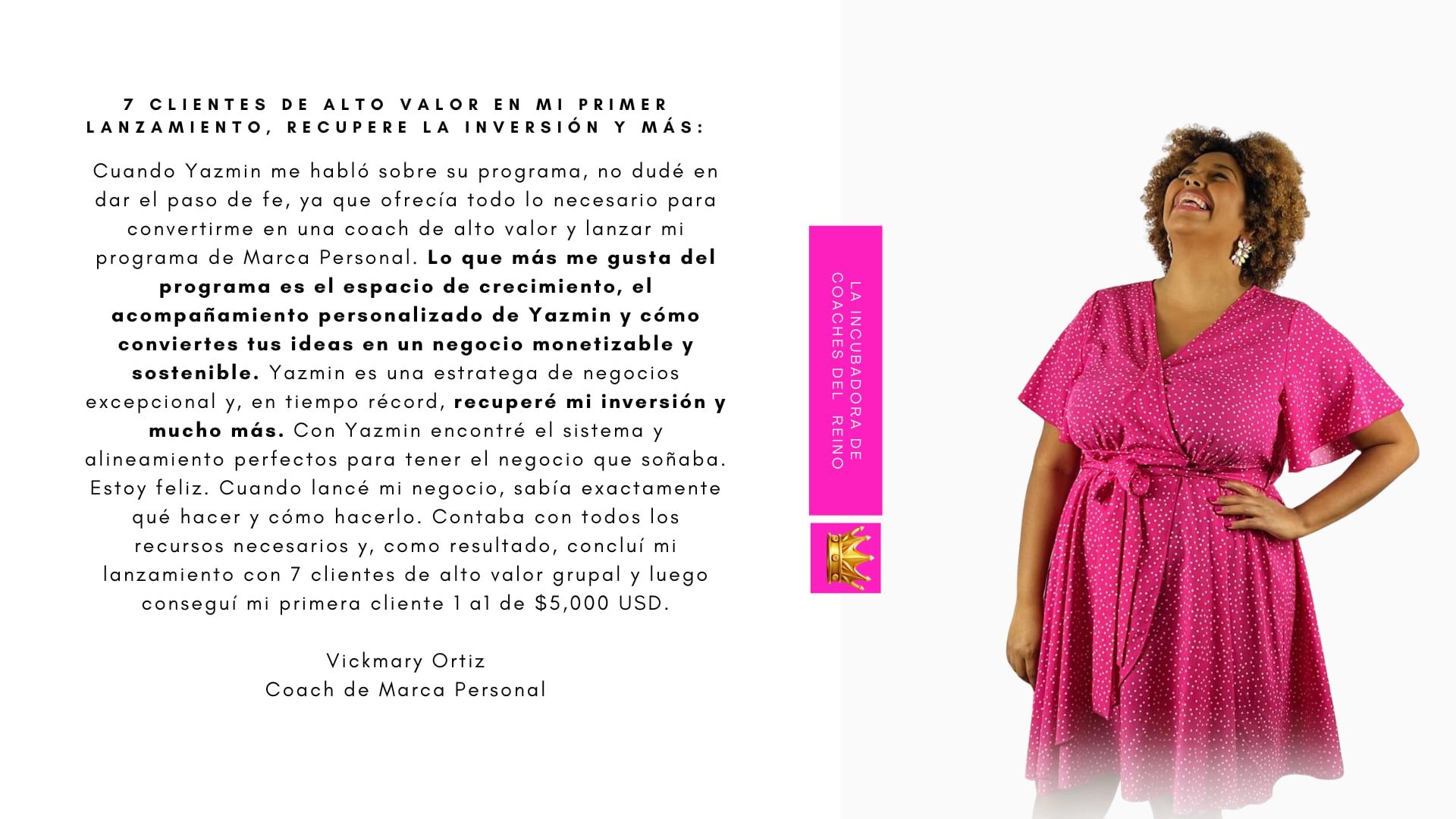 Cuando inicié mi negocio, mi mente y mi identidad no estaban alineadas con la de una empresaria exitosa. Luchaba mucho para conseguir clientes. Después de trabajar con Yazmin, redefiní mi identidad, mi cliente ideal, mi oferta y mis sistemas. Subí mis precios a $2,000 y cerré 11 clientas con más facilidad que cuando vendía a precios bajos. Hoy tengo claridad, valor propio y un negocio de mentoría estable y rentable.